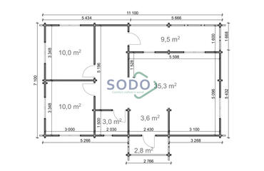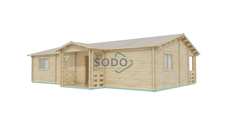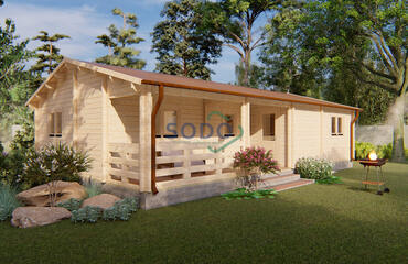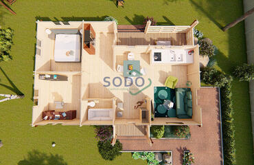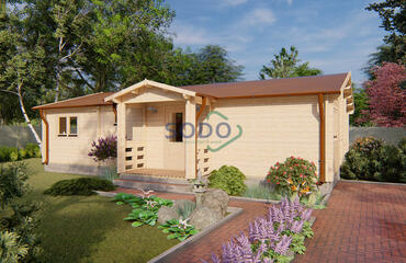This wooden house features two bedrooms, a living area, front and back entrances, and a big terrace for relaxation. With a classic roof style, this house is a perfect solution for a country house. The open living area creates a cozy and inviting atmosphere, while the terrace provides a great outdoor area for relaxation and entertainment. The front and back entrances provide easy access to the house, making it convenient for everyday use. Overall, this wooden house is a great choice for anyone looking for a comfortable and practical country house design.